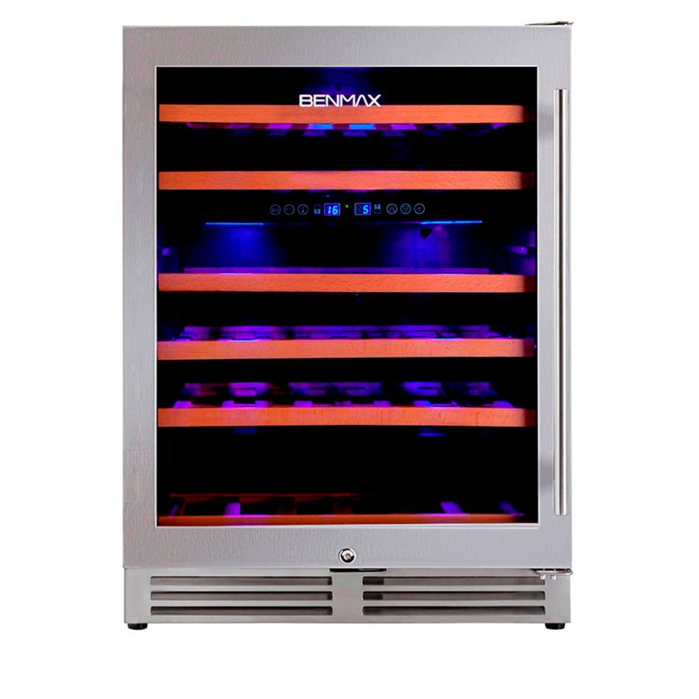 Prateleiras em madeira naval, perfeitas para o descanso do vinho na posição ideal, garantem o charme especial, destacando os vinhos de sua coleção. As Prateleiras são ergonômicas, preparadas para que o vinho descanse na posição ideal, sem vibração e para simplificar o manuseio e limpeza. Porta de Vidro Duplo e Moldura Inox Sem Emendas. A Porta de vidro duplo das Adegas Benmax servem para proteger seus vinhos dos raios ultravioletas e minimizar a troca de calor proporcionando melhor isolamento térmico, diferenciando-se das demais. A moldura Inox sem emendas é produzida com a mais alta tecnologia de corte de metais finalizando com um acabemento perfeito na Adega. A iluminação ideal para se adequar à arquitetura do seu espaço está disponível na BAC51, que conta com sofisticado sistema de iluminação em LED Azul. Display Digital e Controle Dual Zone.