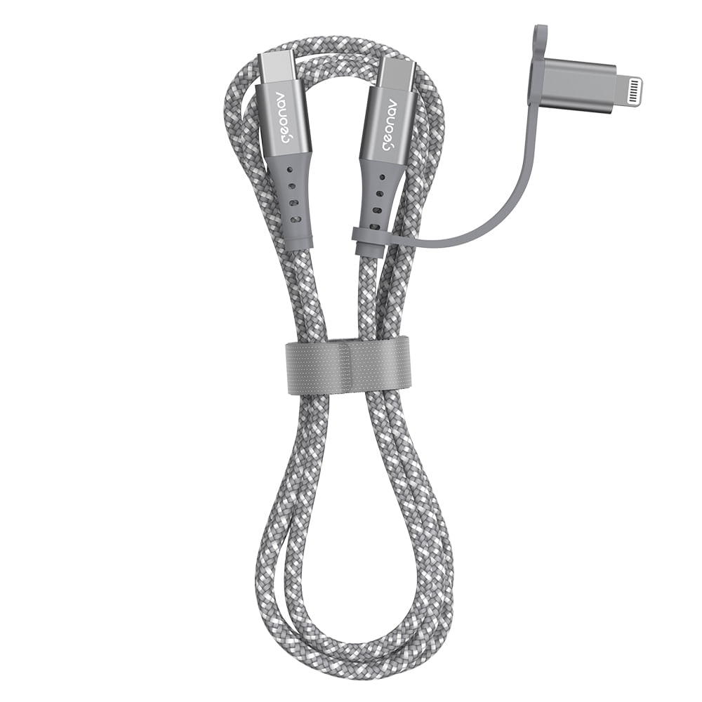 Este é um cabo com 1,50 metro de comprimento, muito resistente revestido em Nylon trançado que pode suportar até 10 mil dobras. É prático e possui dois conectores de saídas adaptáveis. Perfeito para ser usado em mesa de escritórios, casa, carros, viagens e qualquer momento do seu a dia a dia. Compatível com dispositivos de conector USB-C ou Lightning como iPhones e iPads. Também pode ser usado para realizar transferência de dados com velocidade de até 480 Mbps.