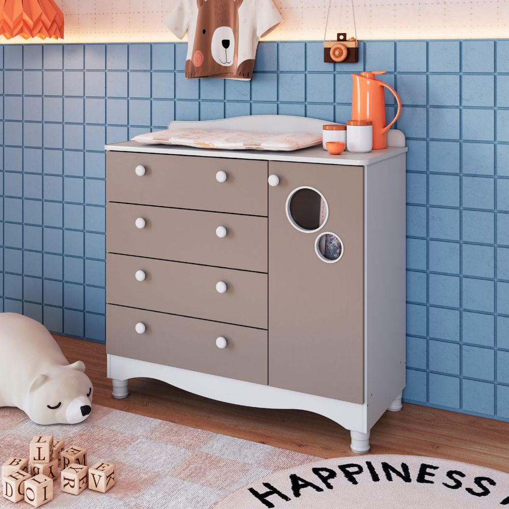 Cômoda Infantil 4 Gavetas 1 Porta Encanto Branco e Cinnamon Completa Móveis