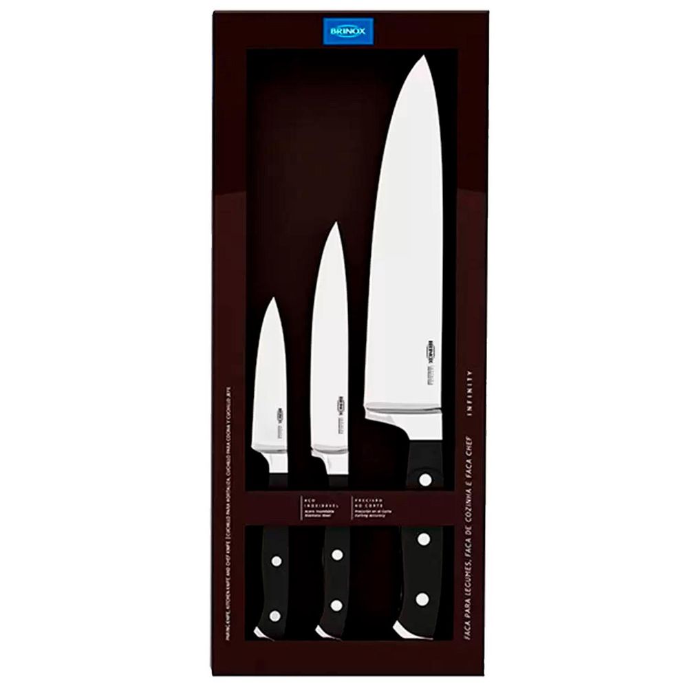 Facas sofisticadas, precisas e com excelente balanço. A linha Infinity é para quem entende que um bom corte significa tudo na hora de preparar sua refeição. Possui lâminas em aço inoxidável temperadas, proporcionando maior durabilidade para o fio. Na espiga da lâmina em aço inoxidável maciço é injetado o ABS, o que garante mais estabilidade. Possuem também, proteção para os dedos e rebites, ambos em aço inoxidável, proporcionando cortes perfeitos. Este kit é composto por faca para legumes, faca para cozinha e faca do chef.