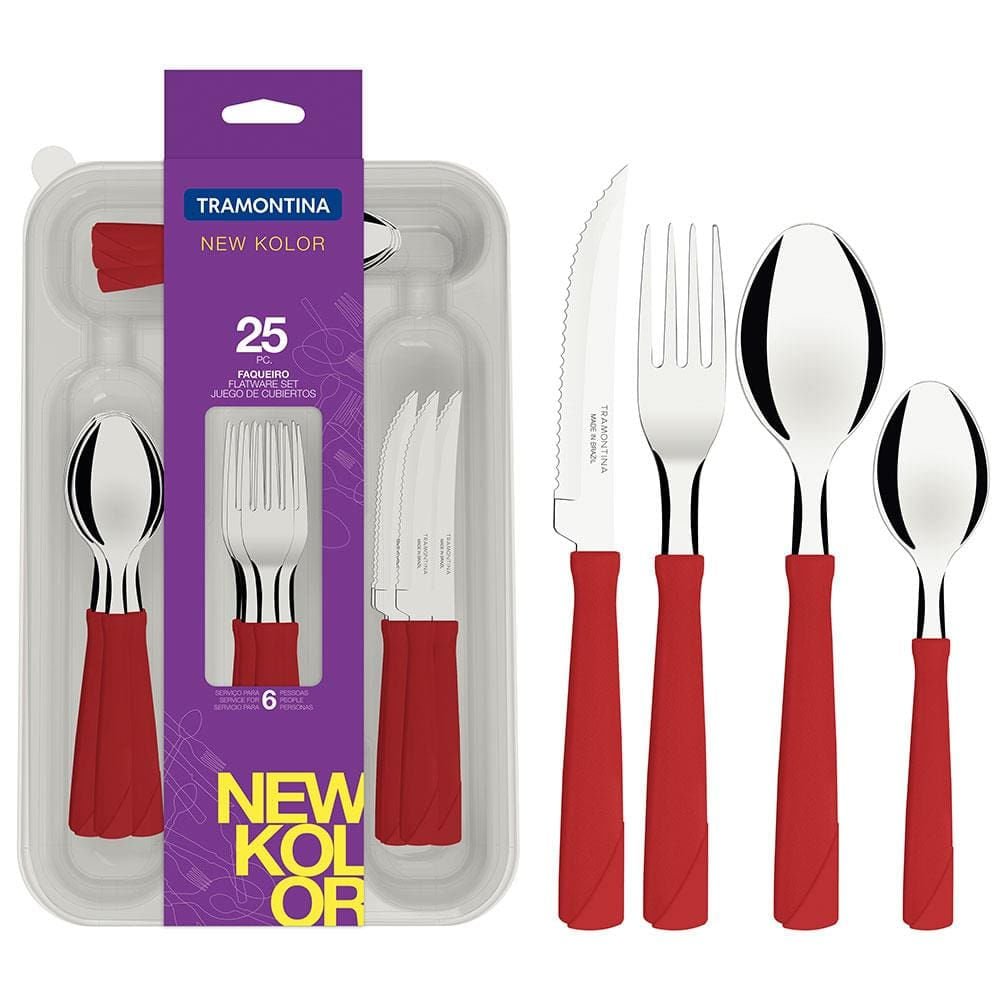 Faqueiro 25 Peças Tramontina New Kolor em Aço Inox com Gaveteiro - Vermelho