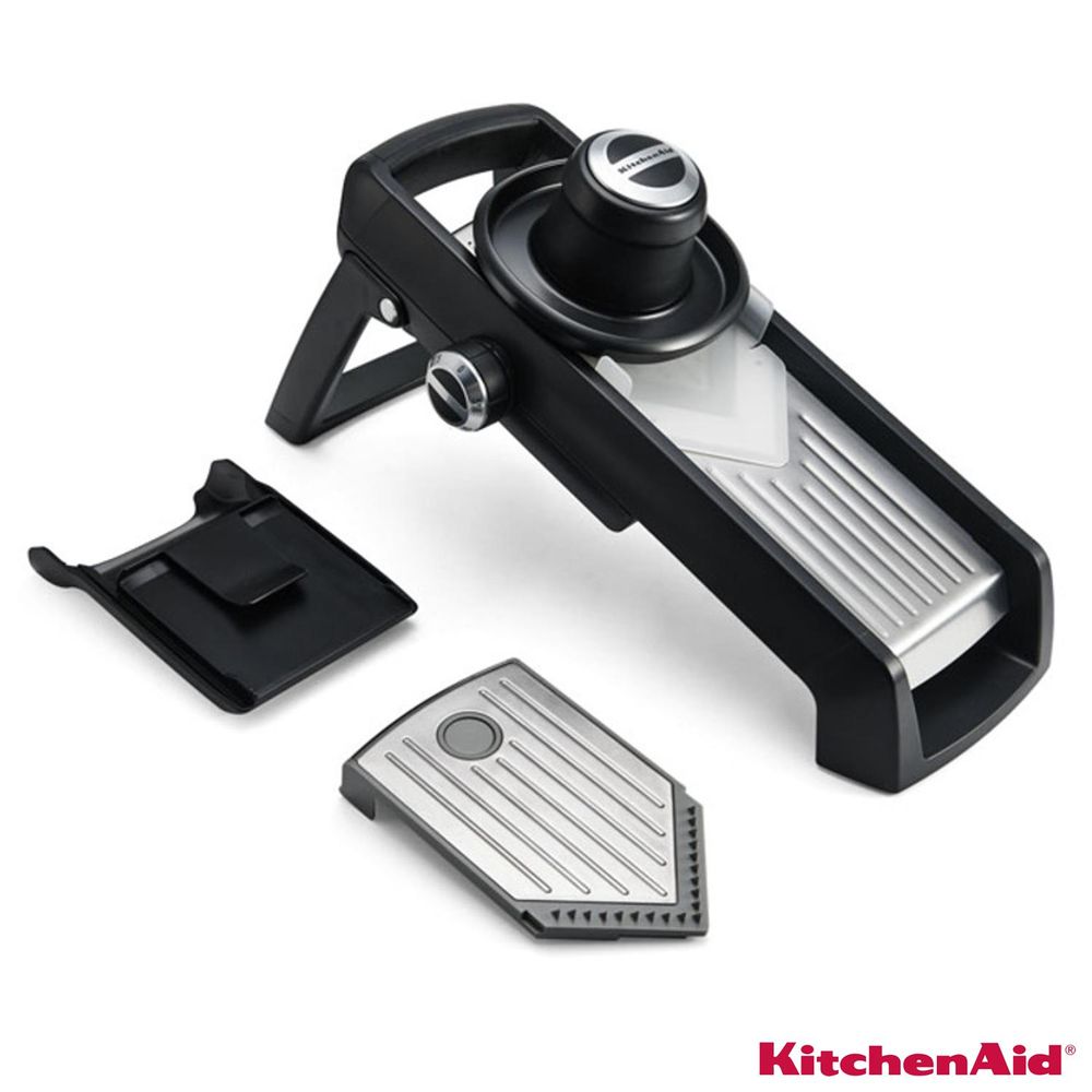 Este cortador Mandoline da KitchenAid possui lâminas de aço inoxidável, e faz um trabalho rápido e eficiente, como fazer fatias finas de pepino, cenoura, batata, entre outros. A mesa de corte é feita em aço inoxidável com detalhes de nervuras para garantir que os alimentos deslizem facilmente. Alojado em plástico grosso e durável, o corpo do cortador possui uma alça de tamanho grande com antiderrapante para um corte estável. Perfeitas para fatiar uma quantidade infinita de frutas e legumes. Importante ressaltar o cuidado que deve-se ter ao manipular o Mandoline, pois as lâminas são afiadíssimas. Não deixar ao alcance de crianças.
