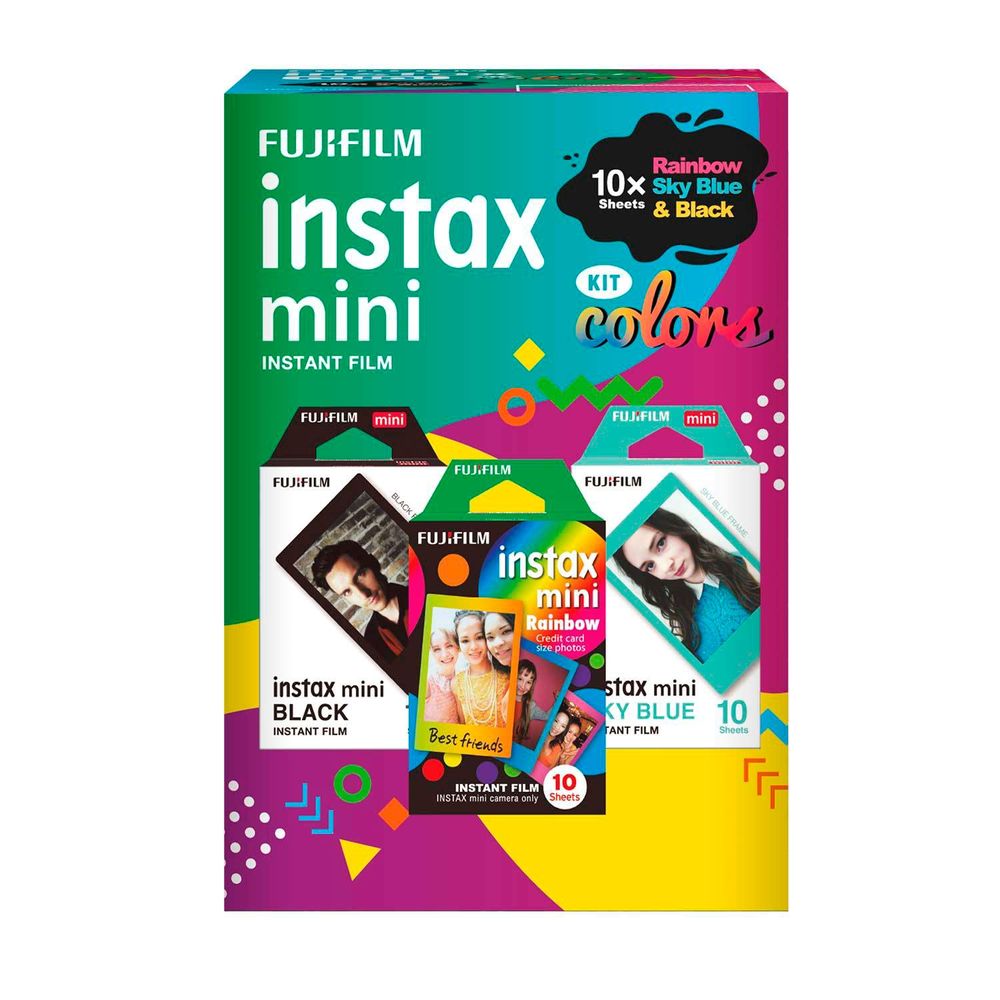 01 Pack com 30 poses (10 instax mini Black, 10 instax mini Sky Blue e 10 instax mini Rainbow)