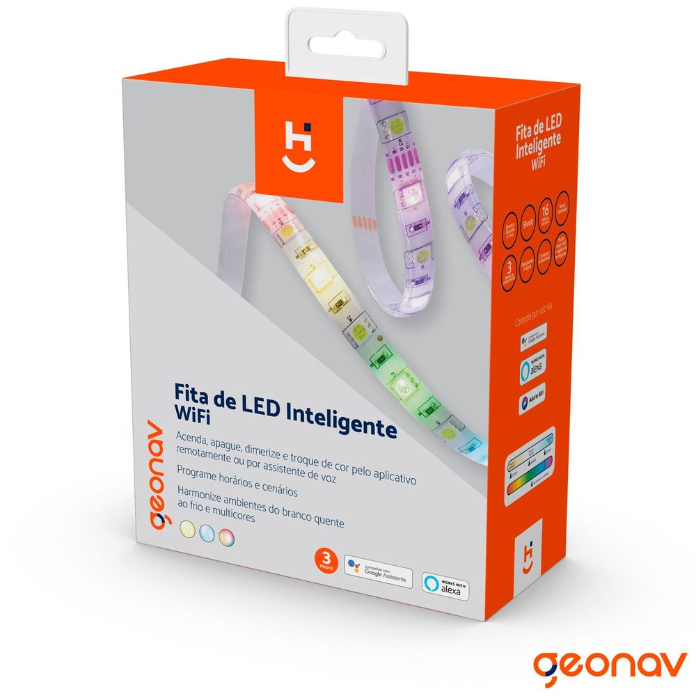 Fita de LED com 3 metros de comprimento HI by Geonav para iluminação inteligente. Permite personalizar um ambiente com suas cores preferidas e criar diferentes cenas para diversos momentos, como festas, jantares ou cinema em família.