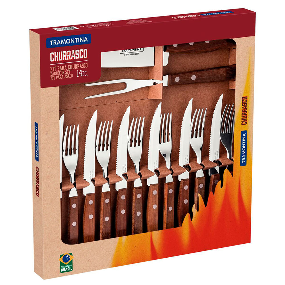 Surpreenda os seus convidados com um belo churrasco e toda a praticidade do jogo de talheres para churrasco Tramontina com lâminas de aço inox e cabos de madeira natural 14 peças da linha Churrasco. Desenvolvido especialmente para honrar esse momento, o jogo é produzido com lâminas em aço inox. Acompanha facas e garfos com cabos produzidos em madeira natural, permitindo que você possa aproveitar muitos momentos com toda a qualidade que só a Tramontina oferece.