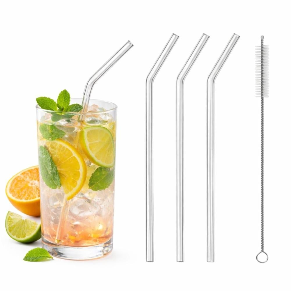 Kit Canudo Curvo Vidro e Escova Drink Reutilizável 4 Peças