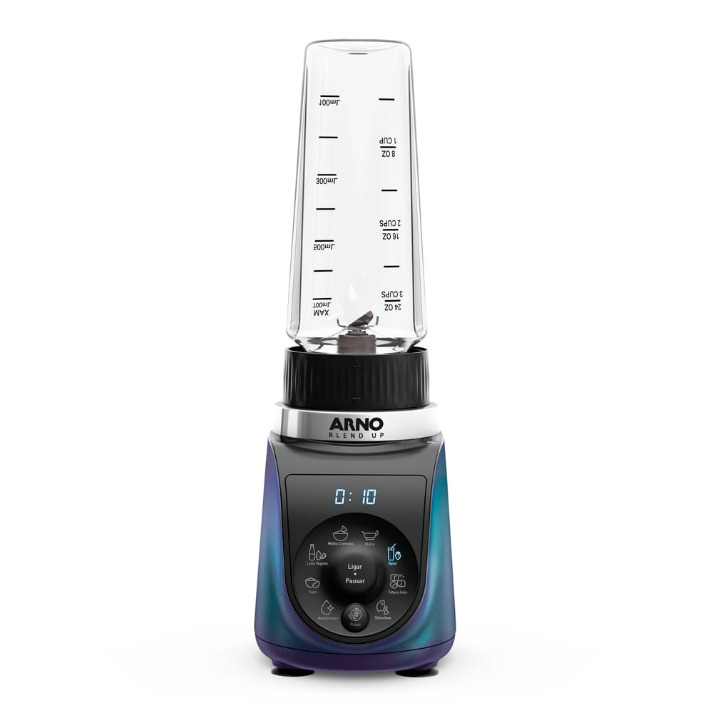 Arno Blend Up é o liquidificador compacto ideal pra quem busca o resultado perfeito para suas melhores receitas, com a máxima praticidade e alto desempenho. Motor super potente com 1000W e a exclusiva tecnologia Powelix, ele oferece desempenho até 3x mais eficiente. Possui 8 programas automáticos, para preparar leite vegetal, suco, molho cremoso, molho, sopa, triturar gelo, além do modo silencioso e auto limpeza. Acompanha 2 garrafas inquebráveis de Tritan*, de 400ml e 700ml, perfeitas para levar na mochila, para a academia, trabalho ou onde você estiver e beber direto no copo. Ele também conta com lâminas removíveis, modo de limpeza automática e escova inclusa, que tornam a higienização muito mais prática no dia a dia. Além disso, o produto é integrado ao app da Arno, com mais de 100 receitas saudáveis para inspirar sua rotina e facilitar seus preparos. Com design compacto e funcional, o Arno Blend Up é a solução ideal para quem busca uma alimentação equilibrada, com agilidade, eficiência e praticidade todos os dias.