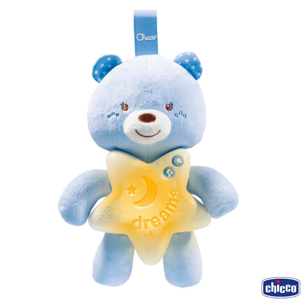 Um ursinho macio com melodias suaves e luzes que acalmam o bebê na hora de dormir. 10 minutos de músicas clássicas e sons da natureza (ondas, canto de passarinhos, chuvas de verão). Luz noturna com 2 intensidades luminosas para criar uma atmosfera mágica na hora de dormir.