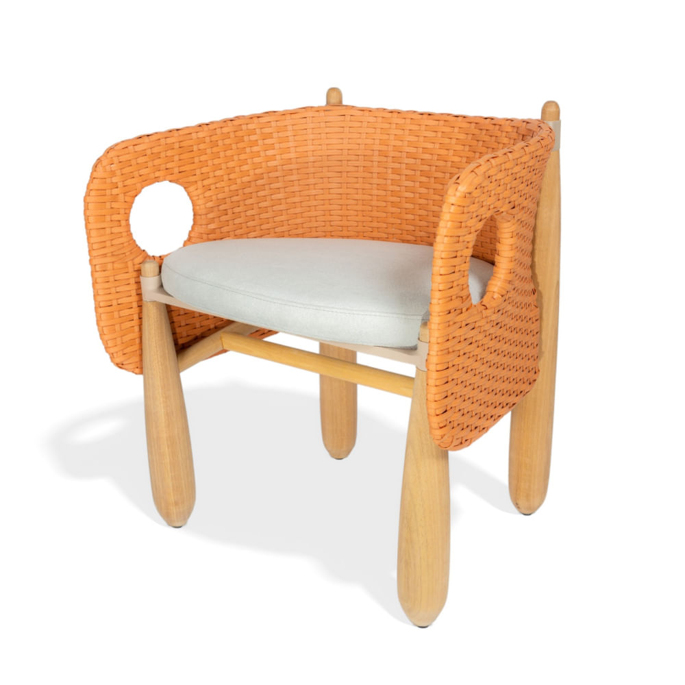Poltrona Aruanã Verniz Madeira Tauari (ambiente interno) Assento em Tecido e Encosto em Fibra