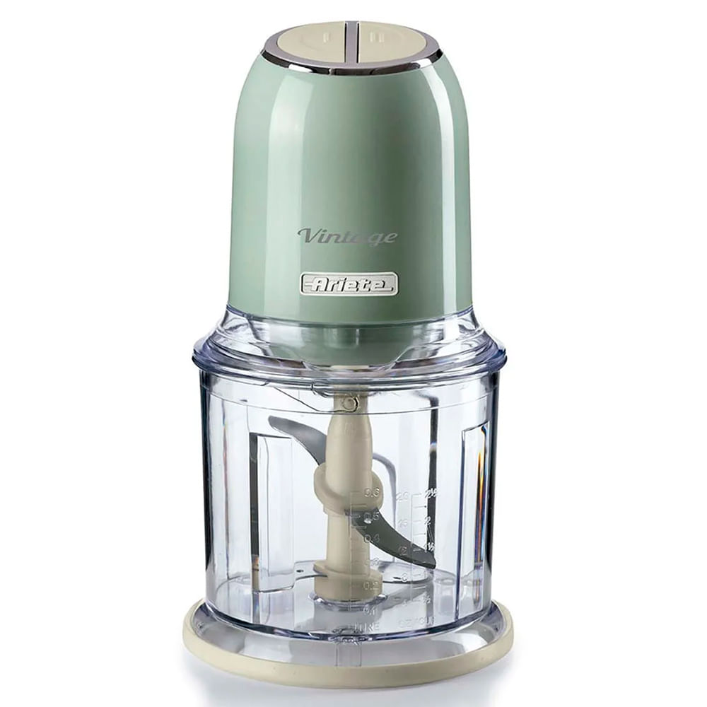 A Linha Vintage da Ariete é enriquecida com um produto indispensável para suas receitas na cozinha: um triturador com linhas retrô e suaves tons pastéis, perfeito para trazer um toque de estilo e funcionalidade à sua cozinha. Graças aos seus 250 Watts de potência e 4 lâminas de aço inoxidável, o Vintage Chopper permite picar qualquer ingrediente para as suas receitas: desde vegetais a carnes, queijo, pão, frutos secos e até gelo. As 2 velocidades, que podem ser acionadas com os dois botões na parte superior do picador, permitem picar finamente os alimentos, enquanto os pés antiderrapantes garantem a máxima aderência do produto à bancada.
