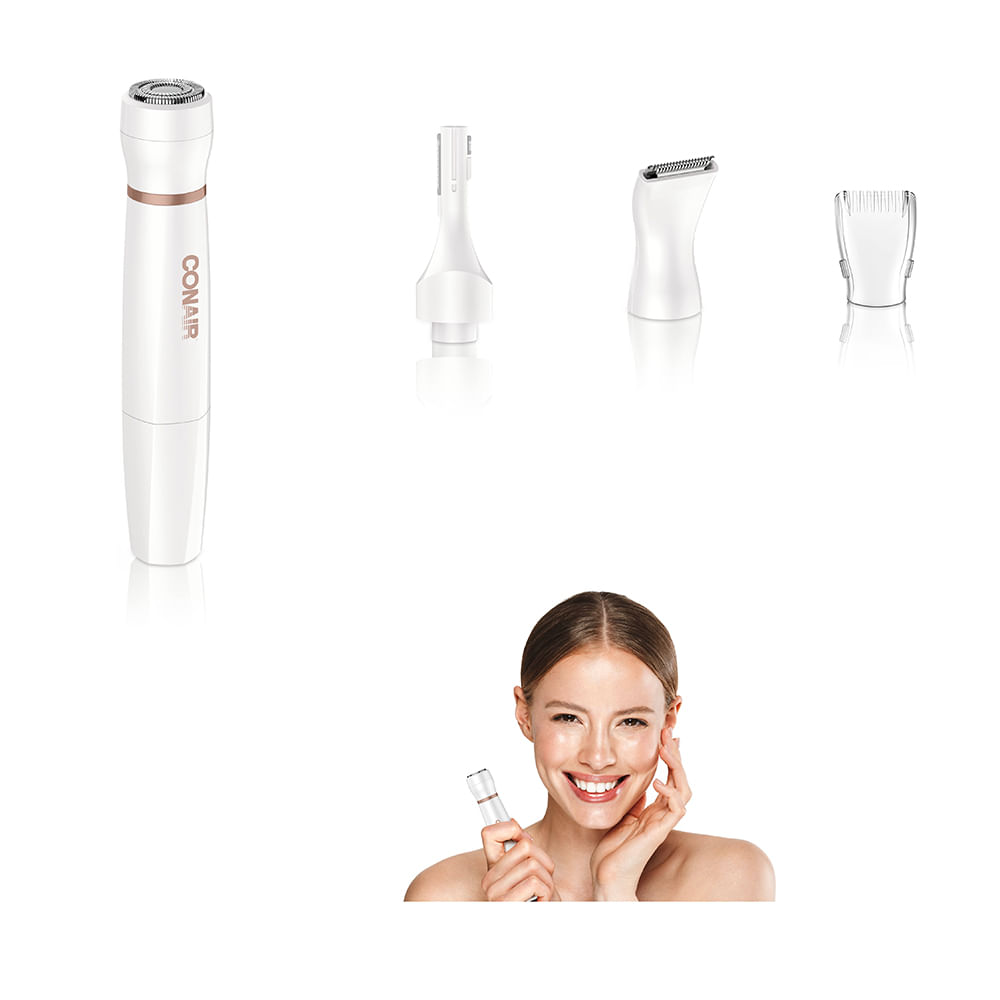 Sistema de Depilação Facial All-In-One Conair. O sistema de corte facial Satiny Smooth All-in-One da Conair remove de forma rápida e indolor os pelos indesejados do rosto ou corpo. Também pode ser usado para aparar áreas delicadas para resultados suaves, bonitos e sem cortes. Com lâminas hipoalergênicas para menos irritação e pode ser usado no chuveiro ou fora dele. Ele vem com 5 acessórios versáteis para todas as suas necessidades de depilação. O barbeador rotativo ajuda a remover pelos faciais indesejados em áreas delicadas como lábio superior, queixo ou bochechas; um aparador de cabelo multiuso proporciona um barbear rente e confortável nas pernas; axilas ou área do biquíni; aparador de sobrancelhas para modelar a sobrancelha perfeita; um pente para detalhes e outro para sobrancelhas. Este depilador tem design elegante e compacto, tornando-o perfeito para viagens ou retoques. Suave o suficiente para uso diário, inclui uma bolsa de armazenamento conveniente. Funciona sem fio e com bateria (requer 1 bateria AA, não incluída).
