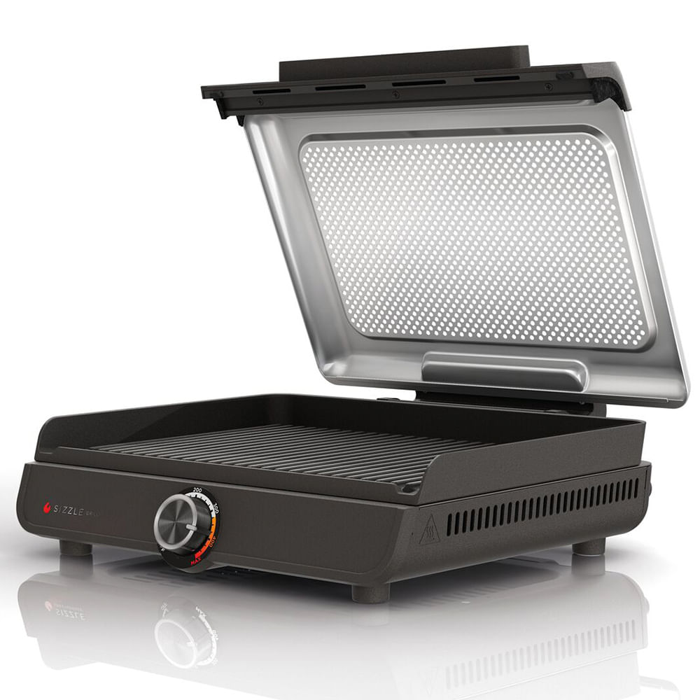 A tampa de malha perfurada elimina a fumaça da sua cozinha e reduz os respingos, e a placa da grelha é equipada com altas bordas e um coletor de gordura para uma experiência de cozimento agradável.