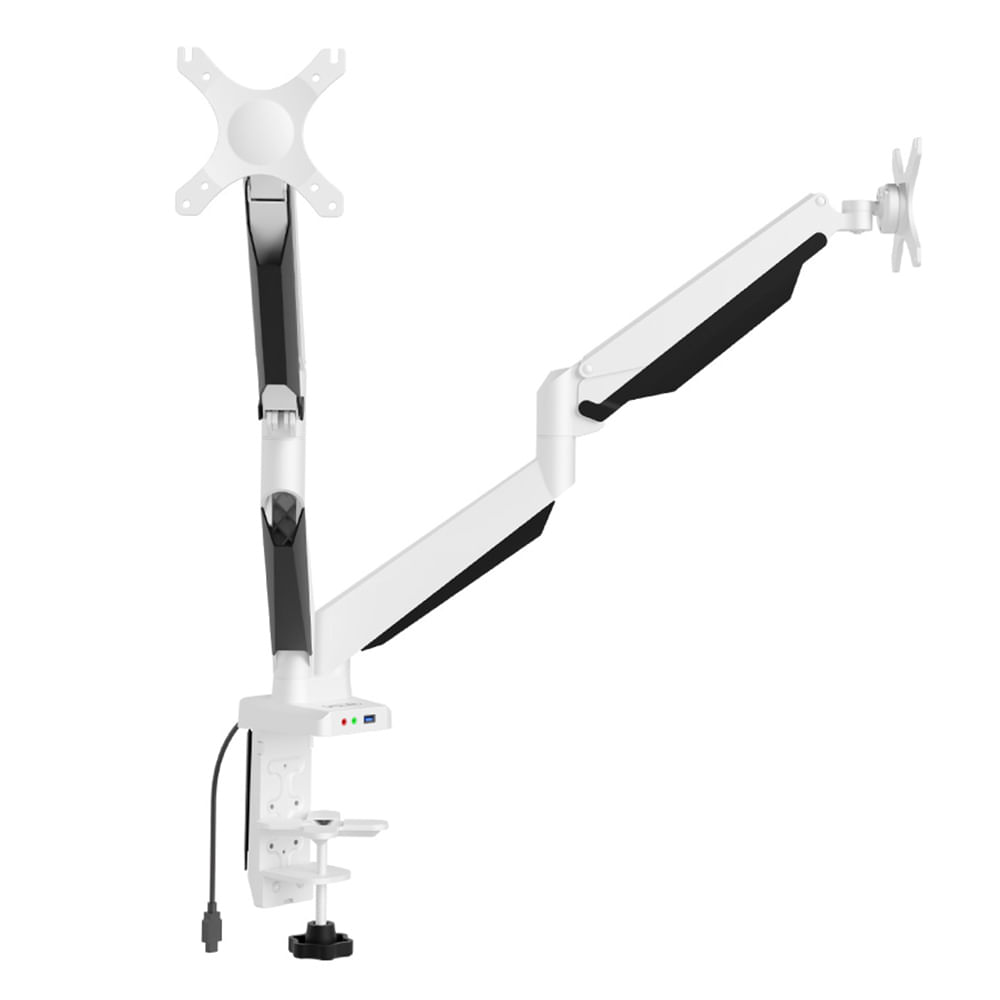 Suporte de monitor articulado de fácil movimentação, feito de alumínio e com cilindros de gás para movimentação sem esforço.