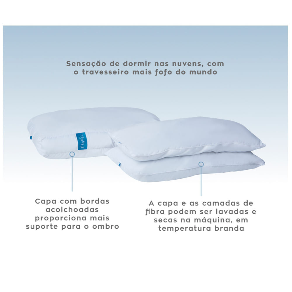 Fluff é o travesseiro ideal para quem gosta da sensação de dormir nas nuvens, com um travesseiro ultra macio, fresco e com toque suave. Com duas camadas de microfibra soft com alturas diferentes, ele permite diversas combinações para se adequar perfeitamente à sua preferência de altura e maciez. Além disso, tem as bordas acolchoadas, proporcionando mais suporte para o ombro e conforto extremo: