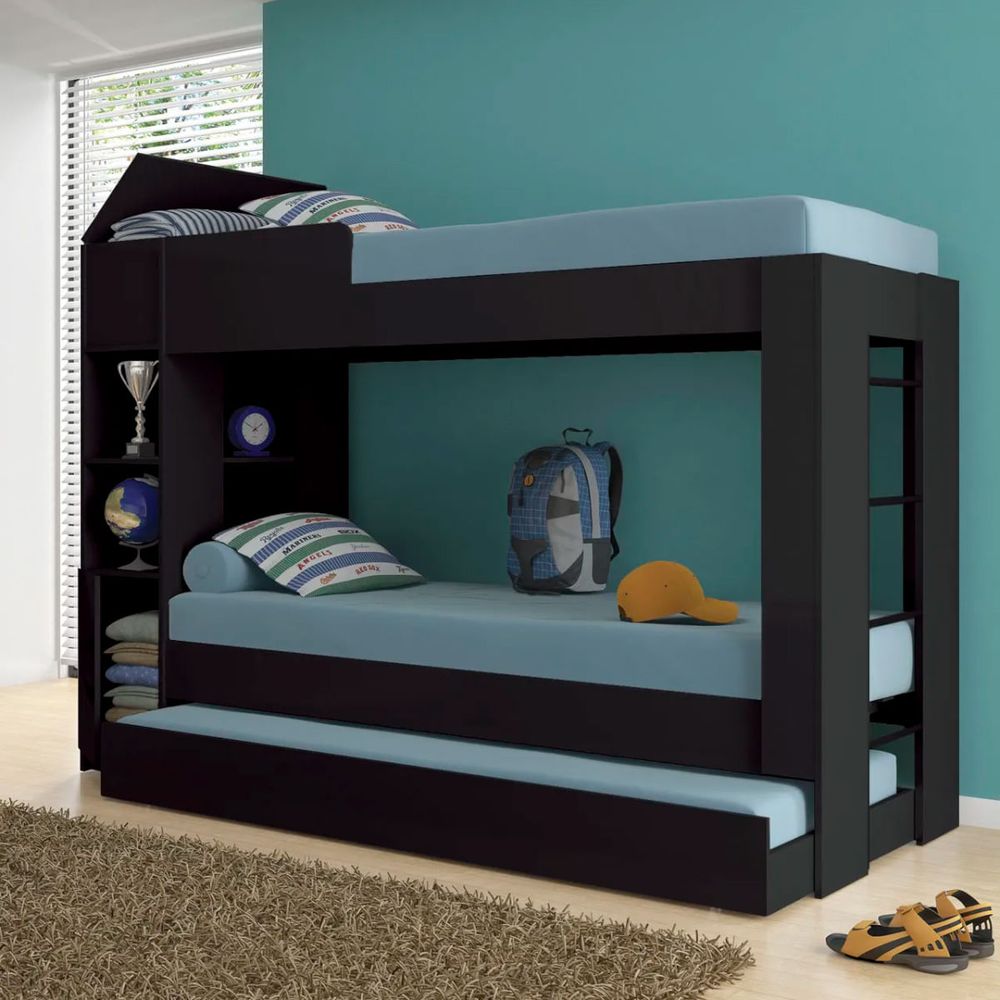 Cama Infanto Juvenil com Escrivaninha Estante e Cama Auxiliar Solteiro Branco Completa Móveis